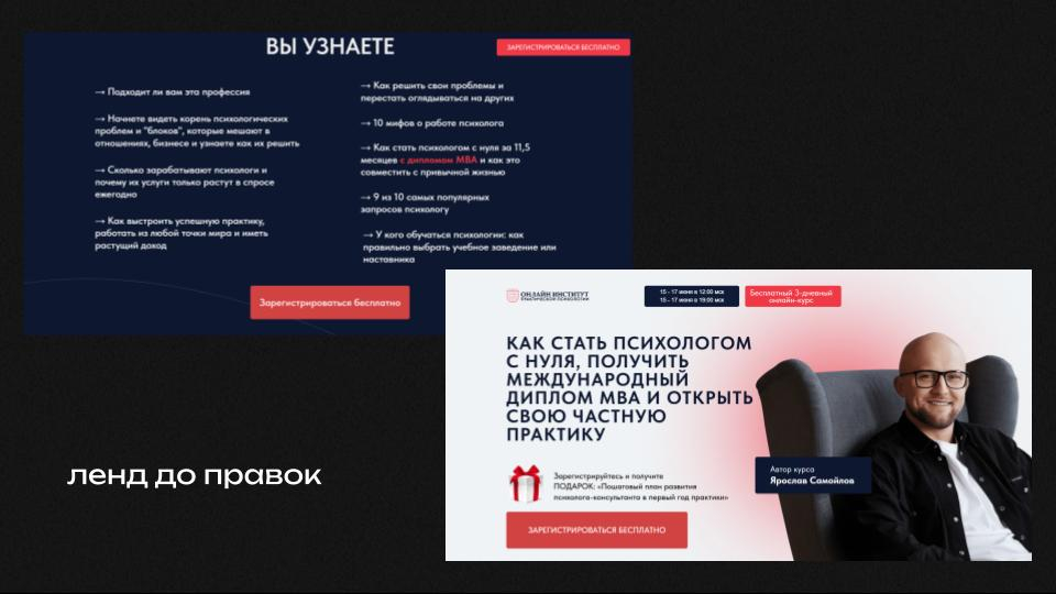 Мы добавили конкретные и привлекательные предложения, такие как «Получите диплом MBA в области психологии» или «Освойте профессию психолога за 6 месяцев с нуля». Эти формулировки подчёркивали ценность обучения и конкретные результаты.
