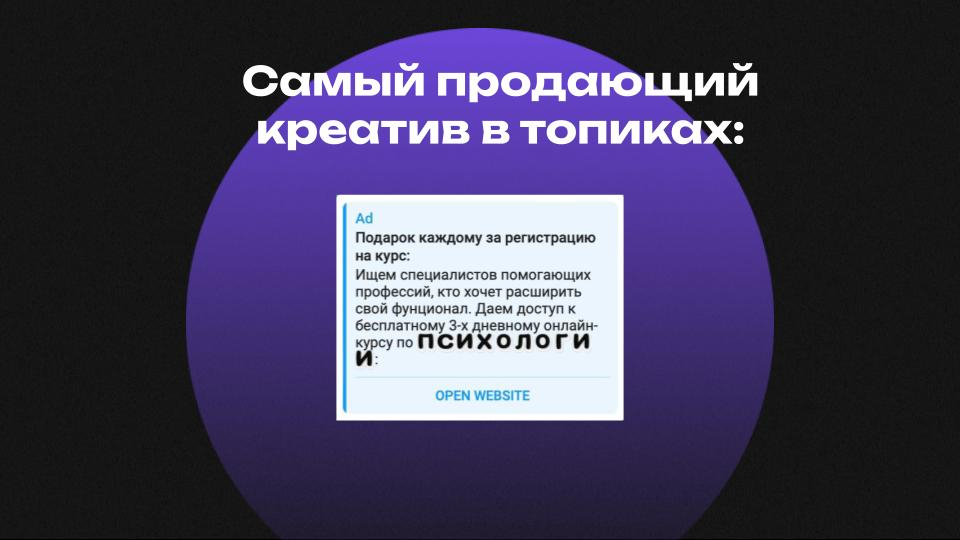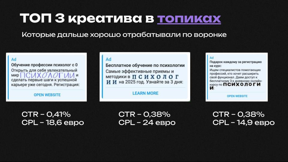 Те, кто рассматривает психологию как способ улучшить семейные отношения или найти новое призвание. Здесь использовались более мягкие и эмоциональные посылы.Каждому сегменту соответствовали адаптированные креативы и офферы, что позволило сократить потери бюджета на нецелевой трафик.
