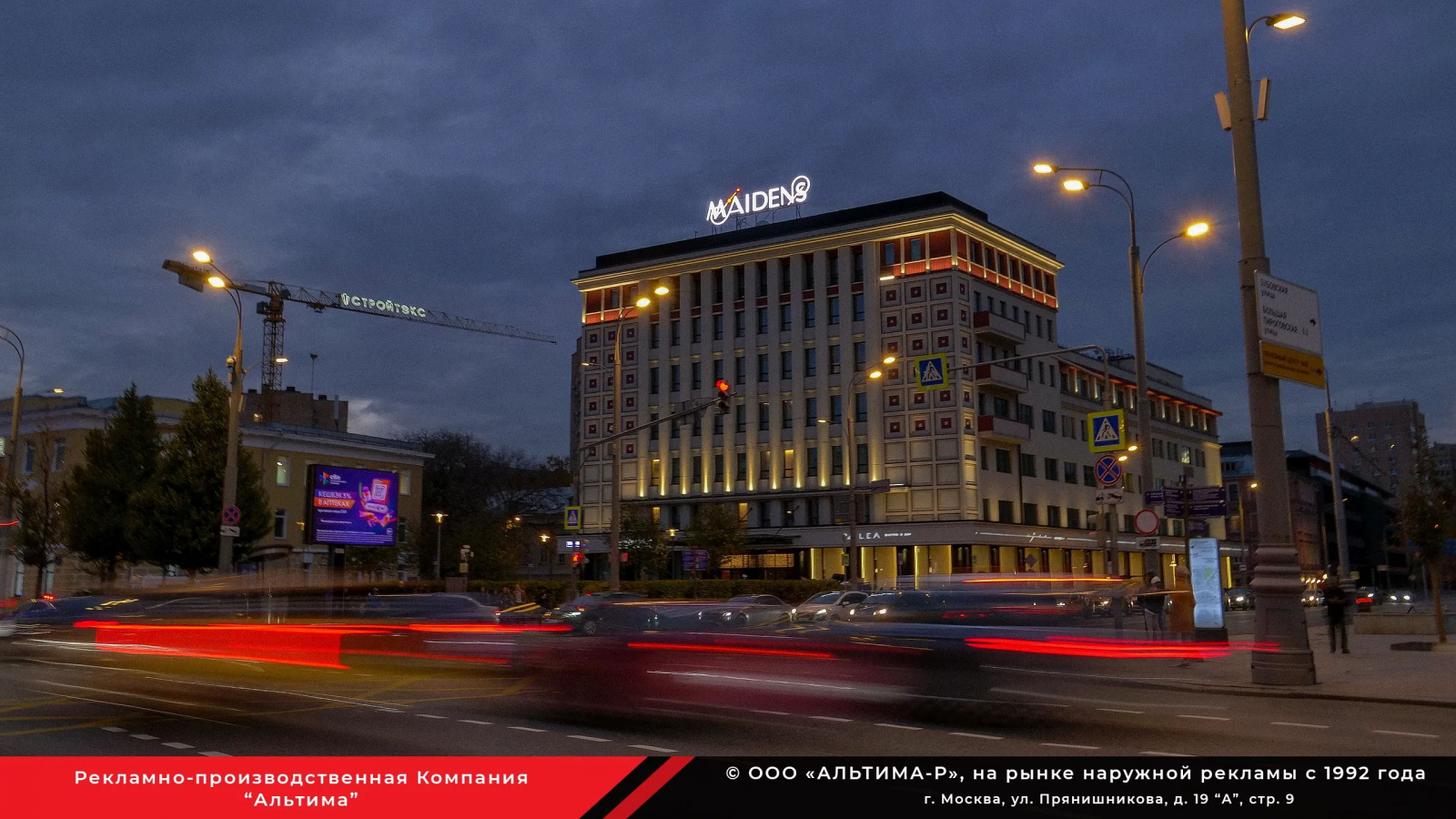 Группа компаний «Альтима» успешно завершила проект по внешнему оформлению фасада отеля Maidens, расположенного по адресу Москва, Зубовская площадь, д. 3, стр. 1. Работы включали изготовление и монтаж крышной рекламной конструкции и нескольких фасадных вывесок, выполненных по индивидуальному дизайн-проекту.