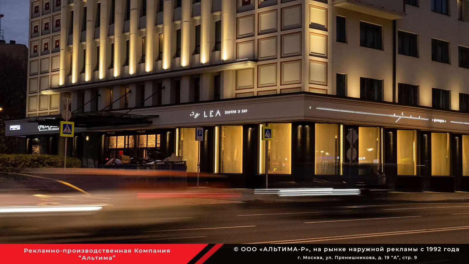 Также на фризе между первым и вторым этажами появилась вывеска в виде объемных букв, изготовленных из окрашенной нержавеющей стали с контражурной подсветкой. Монтаж конструкции требовал особой точности из-за сложной геометрии и тонких элементов. При установке вывески на боковом фасаде здания длиной более 60 метров были использованы специальные монтажные шаблоны, что обеспечило безупречную геометрию размещения. Все кабельные соединения и питающие провода были аккуратно интегрированы внутрь конструкции, что обеспечило не только эстетичный внешний вид, но и повышенную безопасность эксплуатации.