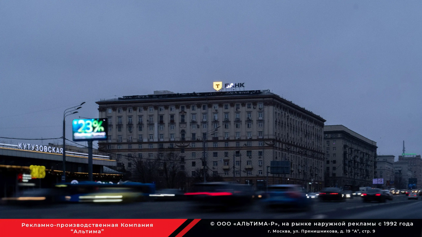 Рекламная установка Т БАНК — это пример рекламной архитектуры нового поколения. Светодинамический модуль делает вывеску особенно выразительной в тёмное время суток, помогая удерживать внимание и усиливать узнаваемость бренда. Это особенно важно для объектов, расположенных вдоль транспортных магистралей — таких как Кутузовский проспект.