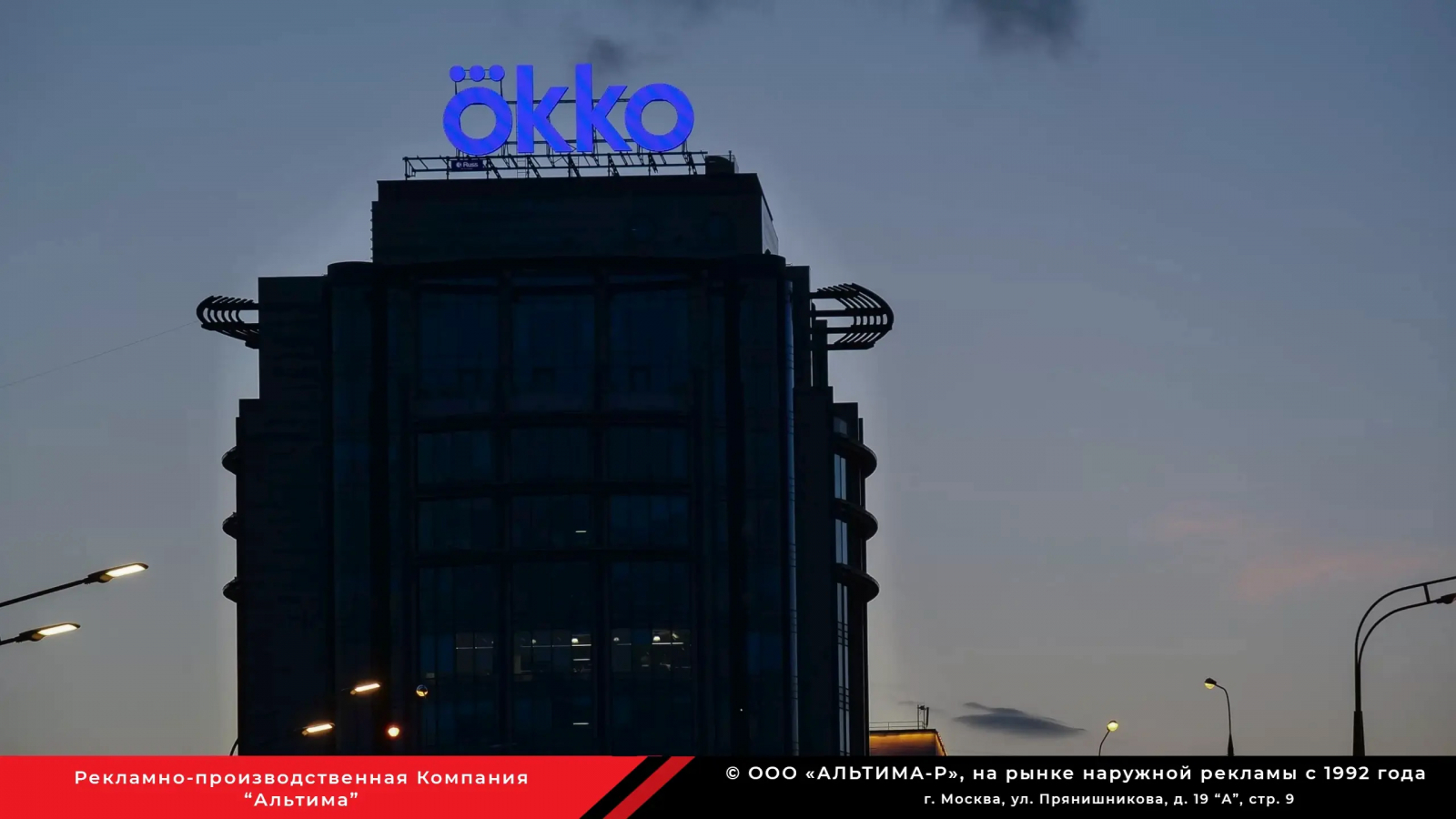 Современная крышная рекламная конструкция была установлена на крыше бизнес-центра в Москве и стала заметным элементом городской среды. Светодинамическая вывеска полностью соответствует стилистике бренда ОККО и поддерживает тематическую направленность бизнеса — цифровые технологии и мультимедийный контент.