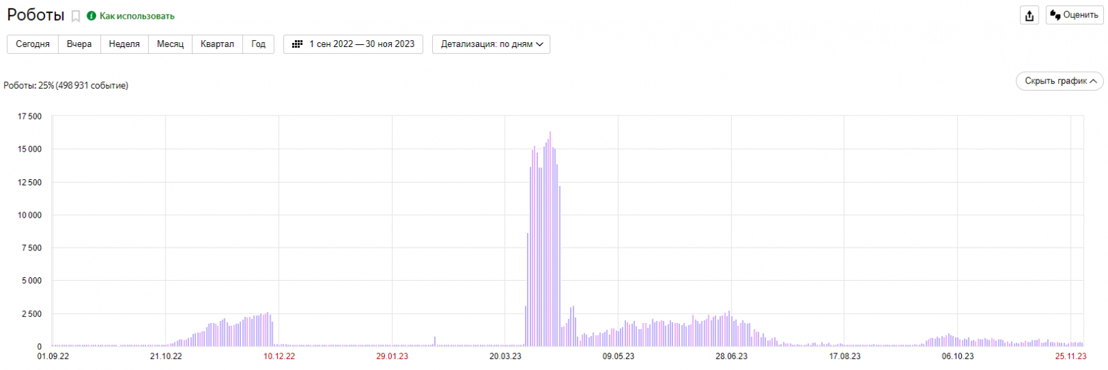 В 2023 году сайт подвергался регулярным атакам. Раз в две недели на сайте возникали стихийные наплывы ботов. Скорее всего, сайт оказался в списках ботоводческих ферм для накрутки посещаемости. Из-за этого пришлось переехать на другой хостинг.