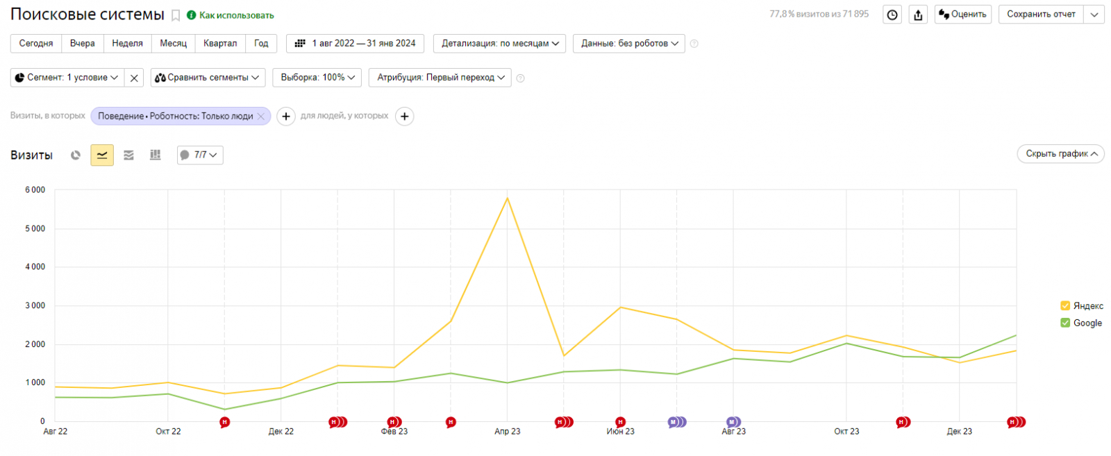 В августе 2022 года трафик из поисковых систем составлял 1520 посещений, в октябре 2023 года число посещений возросло до 4263. Прирост трафика на пике составил 280%, в среднем — 230%.