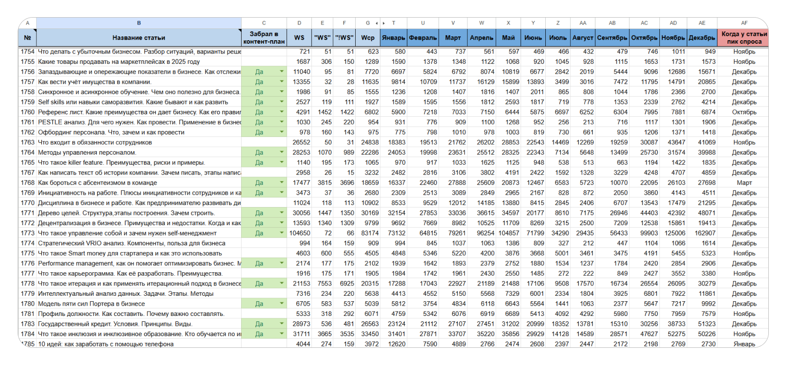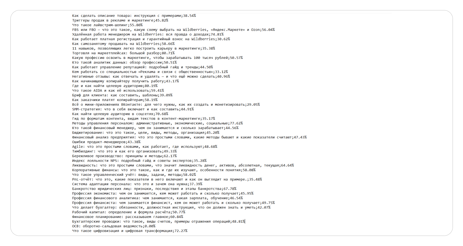 Если коротко, то благодаря парсингу контента с 30–40 сайтов в нише мы собираем много идей для будущих тем, а затем фильтруем их по совпадению с уже написанными материалами.