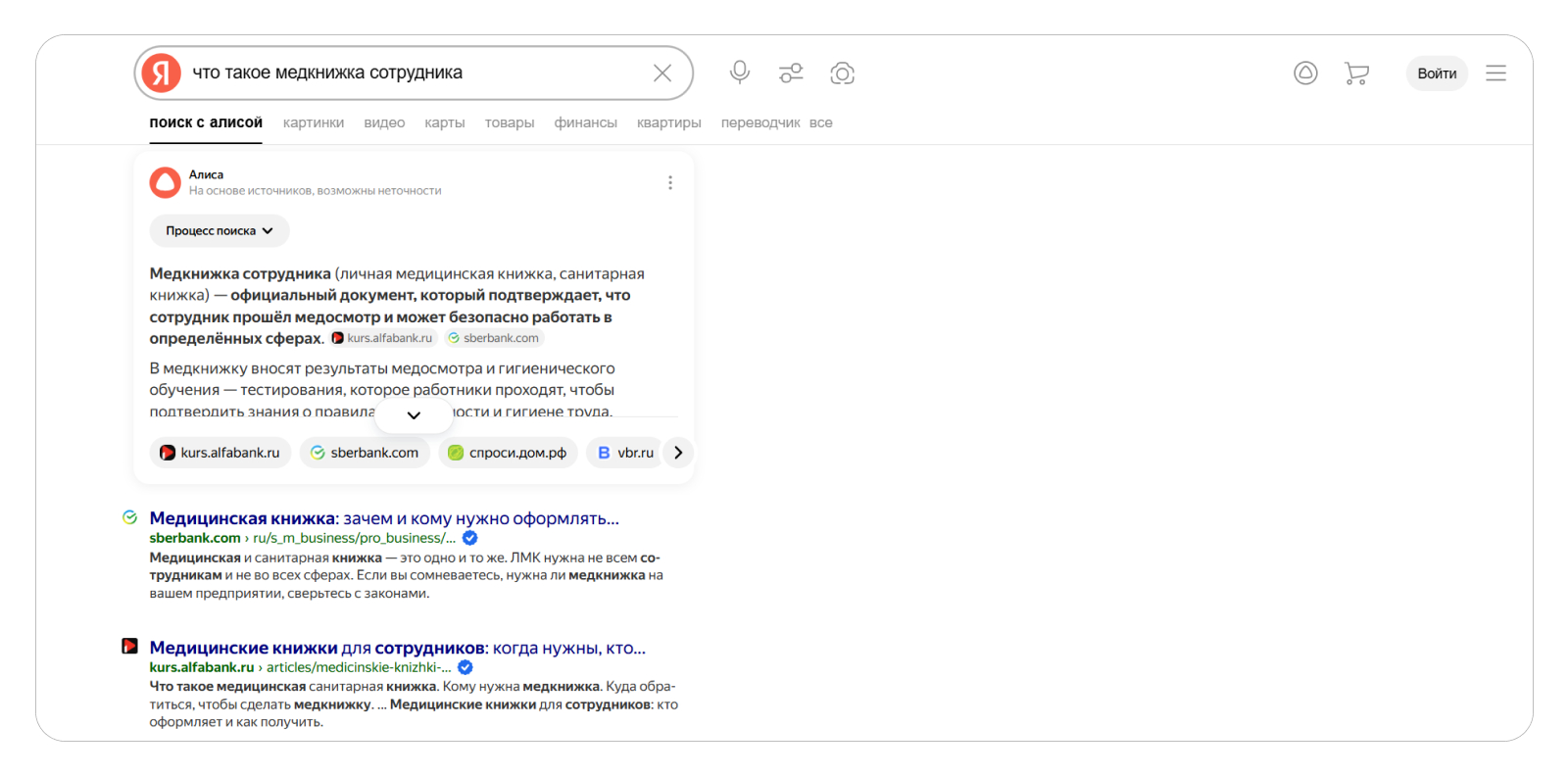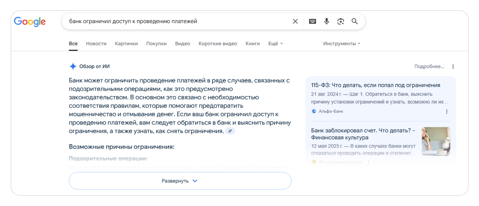 Сейчас огромную роль играет нулевая выдача — AI Overview в Google и «Поиск с Алисой» в Яндексе. В этом блоке с помощью ИИ собирается краткий и емкий ответ на запрос пользователя. Располагается он выше любых ссылок и материалов, поэтому привлекает к себе максимум внимания.