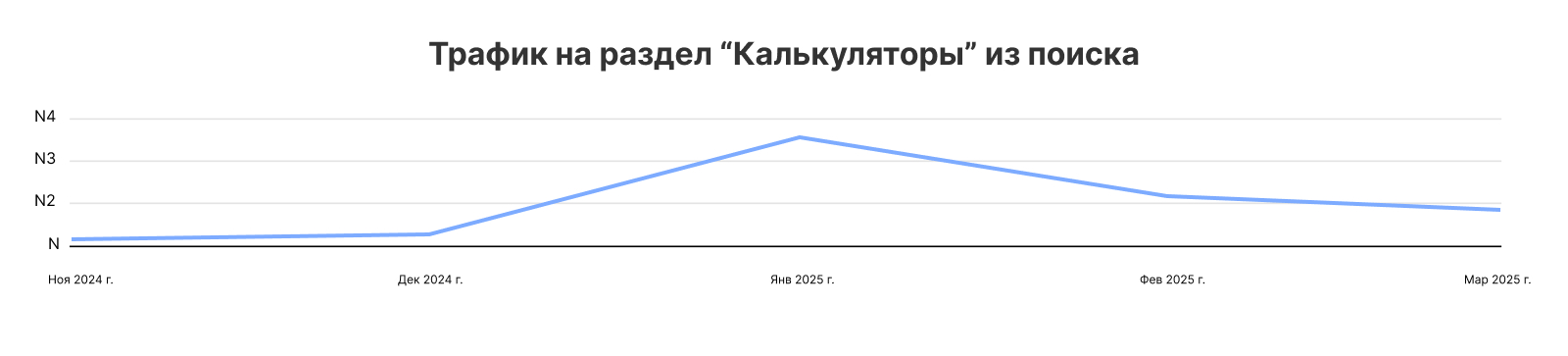 Мы выгрузили все возможные калькуляторы по тематике (от расчета налогов до перевода суммы из числа в пропись), сняли частотность, совместно с продуктовой командой оценили сложность разработки и двигаемся от самых частотных и легко реализуемых. Конечно, давали базовые SEO-рекомендации по структуре и принципу формирования URL. Основная цель раздела — привлекать как можно больше трафика с поиска, и эта цель достигнута.