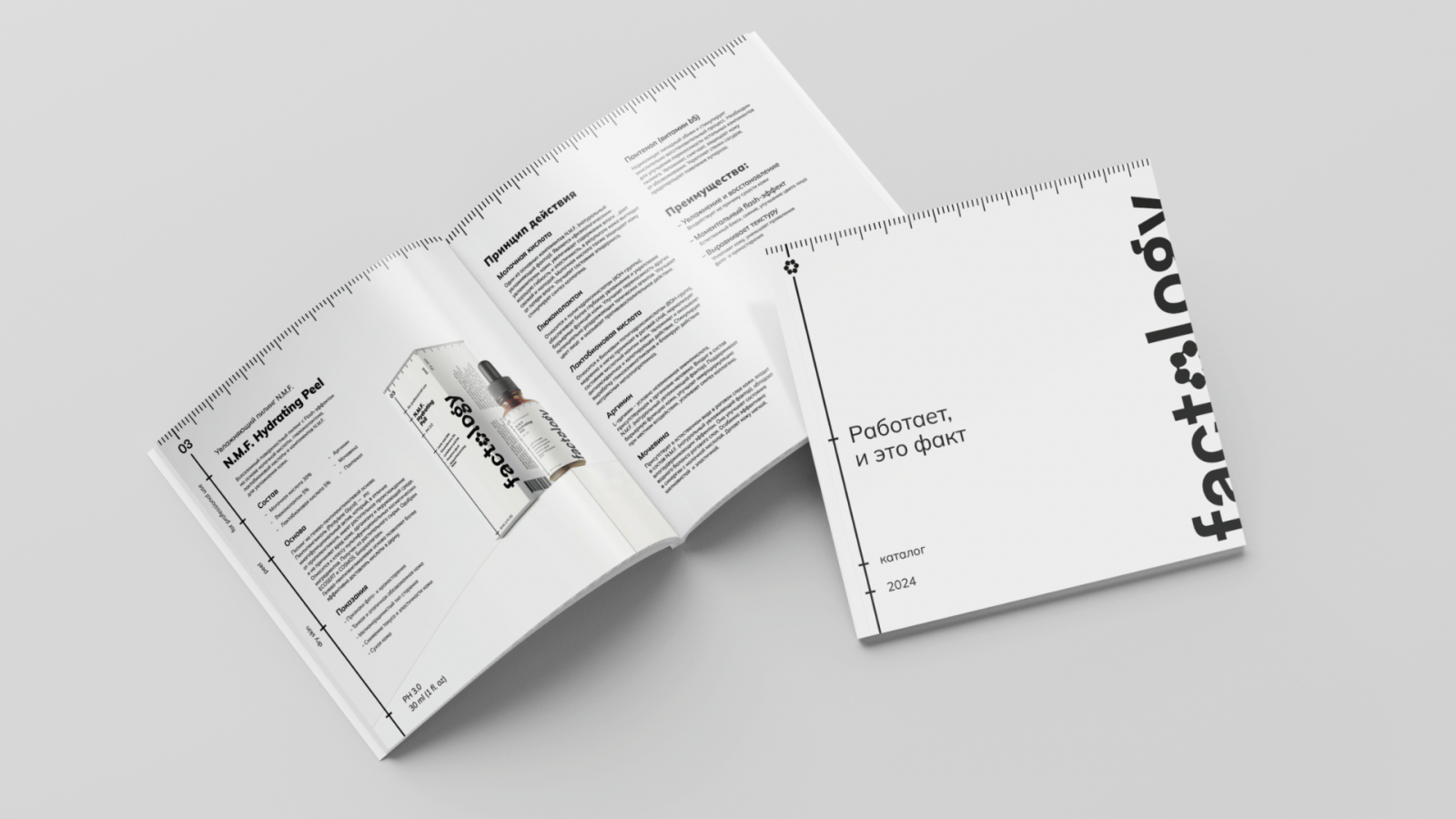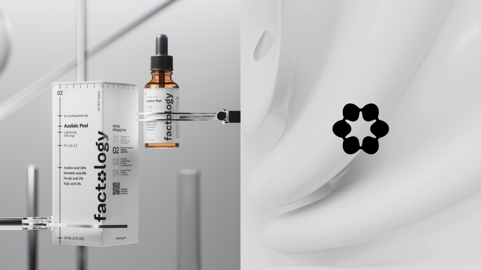 Визуальный язык Factology — это профессиональная косметика, которая говорит на языке медицины. Мы ушли от любых ассоциаций с масс-маркетом и бьюти-полками, где «красиво» побеждает «эффективно».
