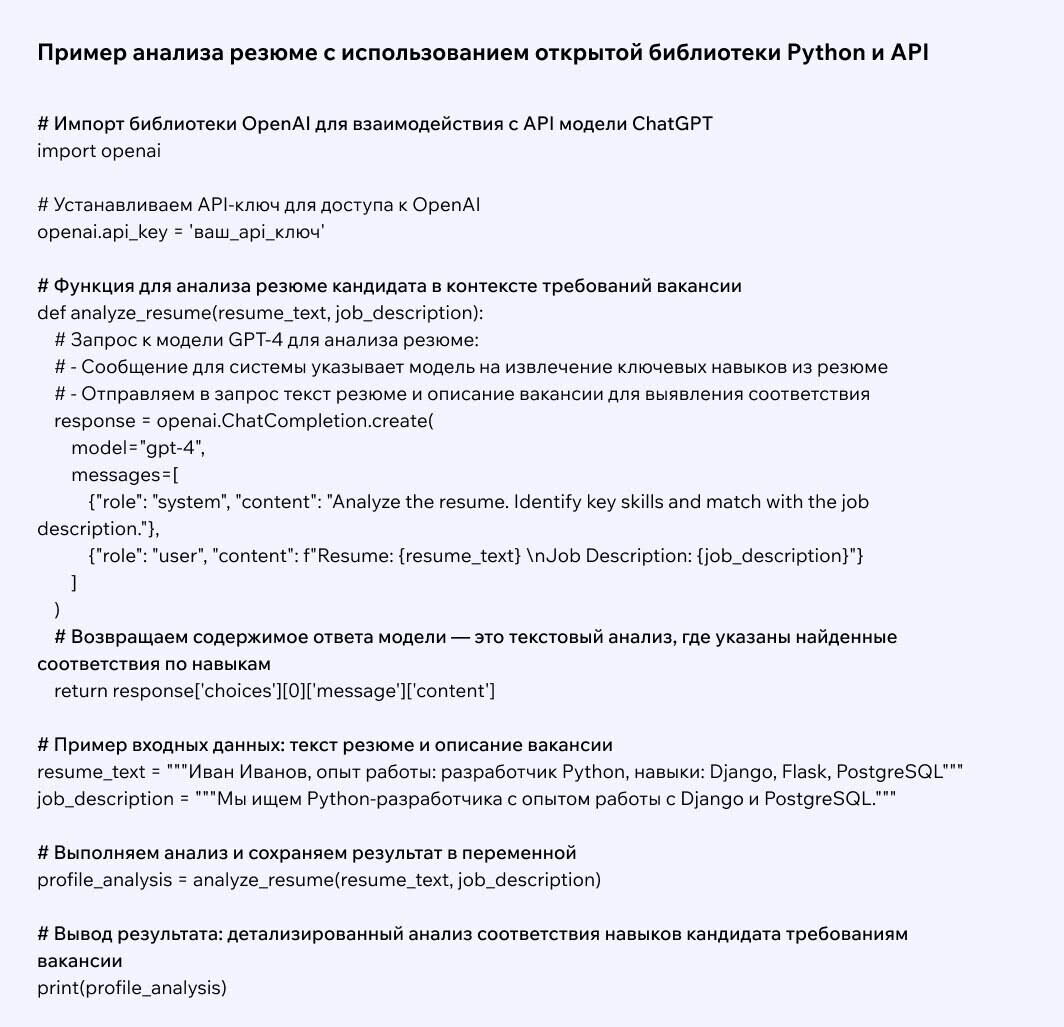 Секрет эффективности ChatGPT кроется в умении глубоко анализировать текст и находить не только очевидные навыки и достижения, но и более тонкие сигналы. Например, стиль письма и манера общения кандидата могут рассказать о его личных качествах больше, чем простые описания. Это позволяет не просто оценить соответствие кандидата конкретной роли, но и проникнуть в суть его профессионального стиля и подхода к работе.