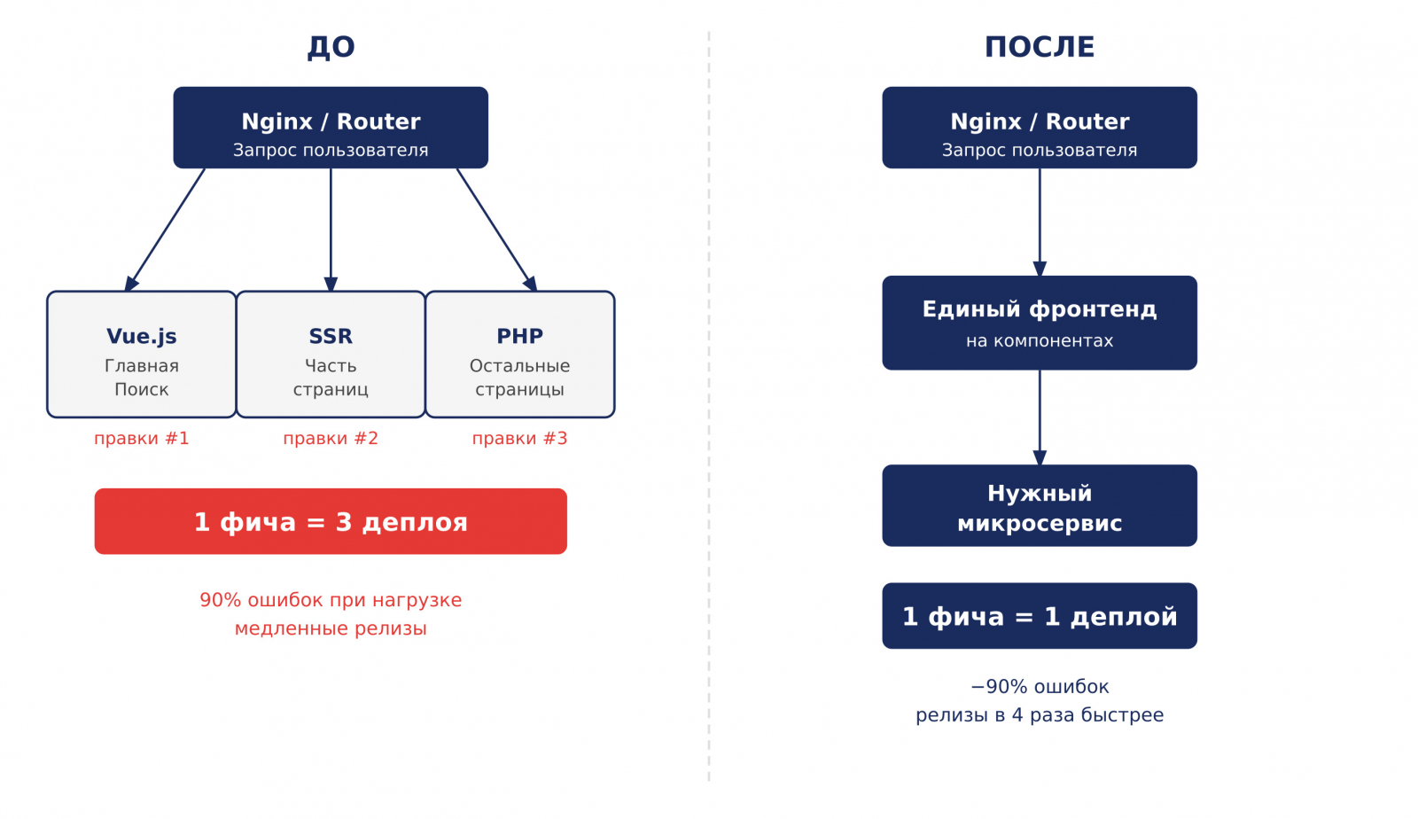 При этом «переписать все» — означало бы на время заморозить продукт. Для e-commerce это прямые потери.