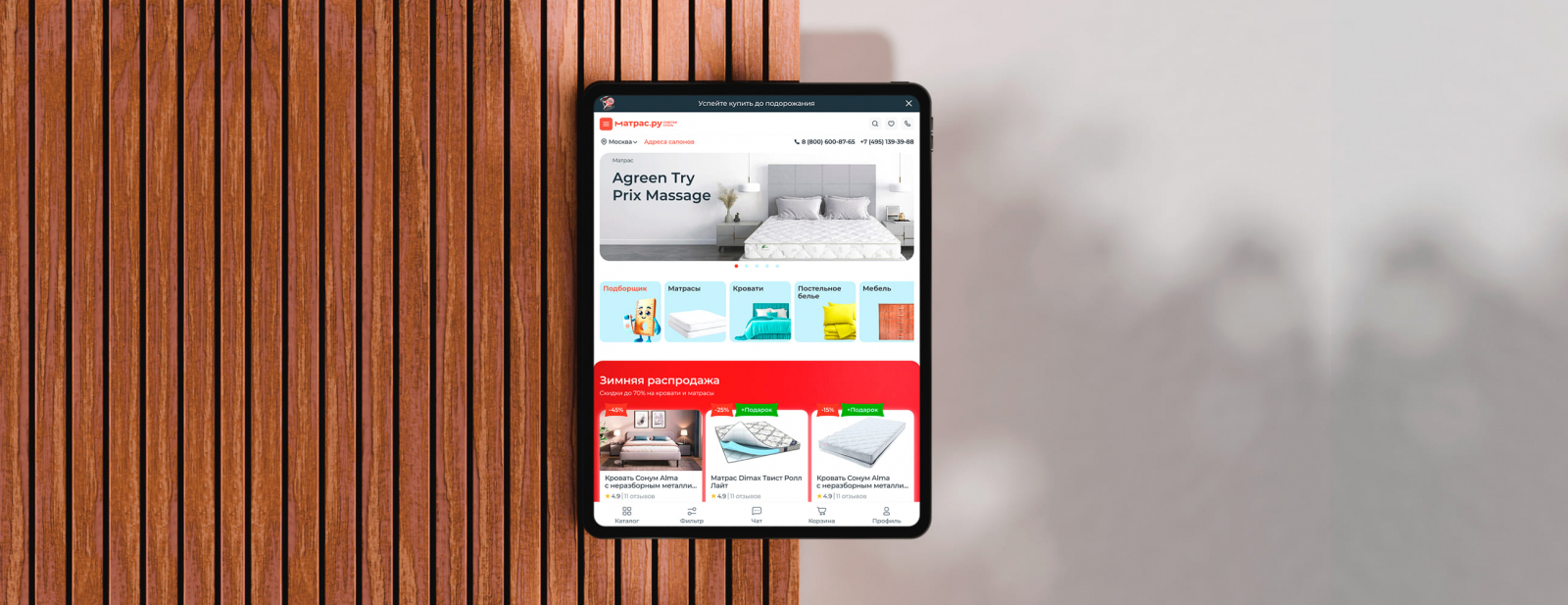 Матрас.ру — крупный интернет-магазин с федеральным охватом. Ассортимент включает как товары партнеров, так и продукцию собственных фабрик. Основная нагрузка — на онлайн-продажи, поэтому требования к стабильности и скорости высокие.