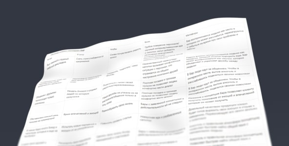 По классике стартанули с исследований. Пообщались с собственниками. Сходили в несколько схожих баров. Отправили ведущего дизайнера Сережу в Москву, чтобы он побывал на территории бара и изучил локацию. Сделали выводы, написали джобсы и нашли удачную идею.