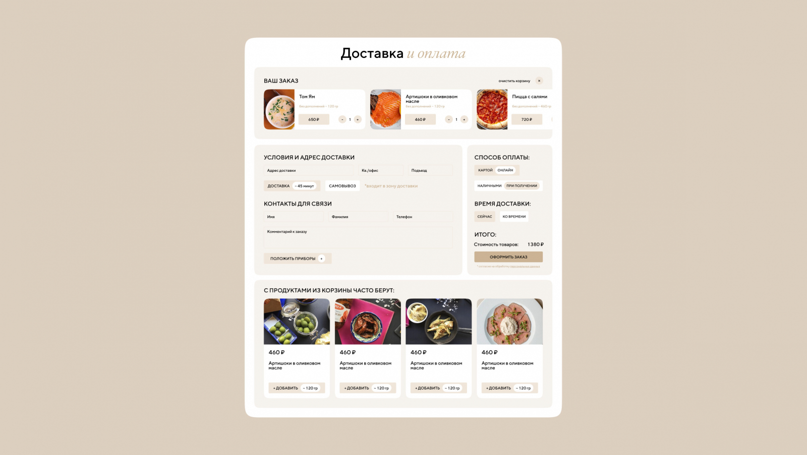 Доставка. То, к чему мы привыкли во время ковида. Ей активно стал пользоваться каждый. Поэтому много времени потратили на проектирование этой страницы. С нее и начнем😉