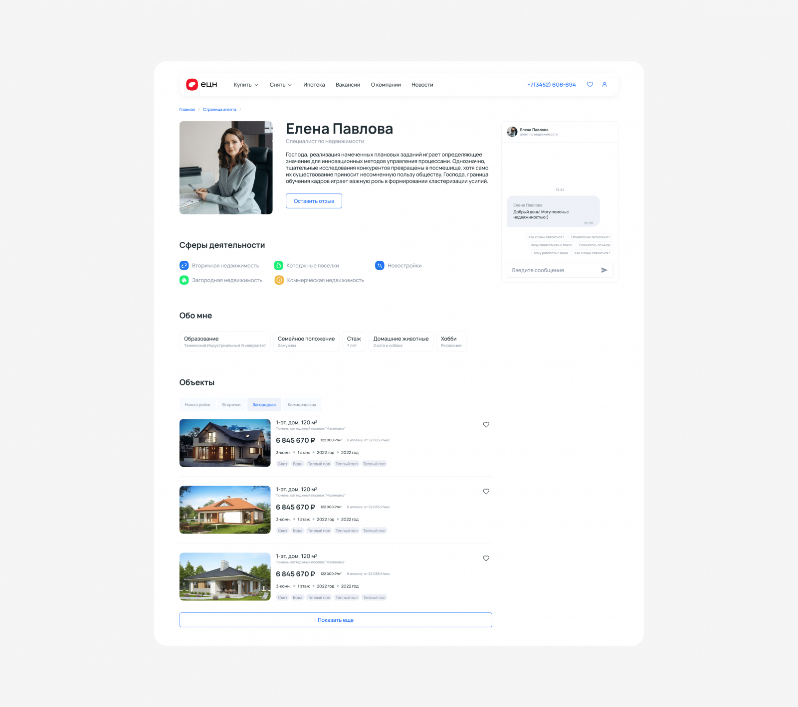 Вместо бездушным форм обратной связи — чат (но не GPT) с автоматическими действиями. Он консультирует об услугах и условиях, а также поддерживает быструю связь со свободным риелтором.
