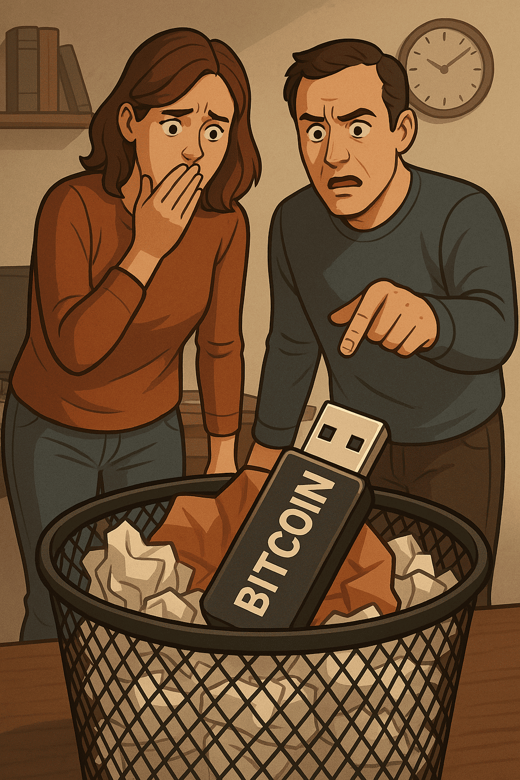 Главные герои — супружеская пара, Том и Элли. Элли проводит уборку в кабинете мужа. В ящике стола она обнаруживает USB-накопитель, среди прочих, казавшихся ей несущественными, предметов. Посчитав его ненужным, она выбрасывает флешку вместе с другим мусором. Позже выяснилось, что на этом носителе хранились данные доступа к криптокошельку с биткоинами на сумму около 3,8 миллиона долларов США.