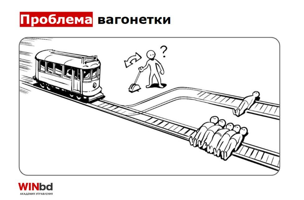 Представьте: по рельсам мчится трамвай. На его пути — пятеро человек. Единственный способ их спасти — перевести стрелку, но тогда под колёса попадает один человек.