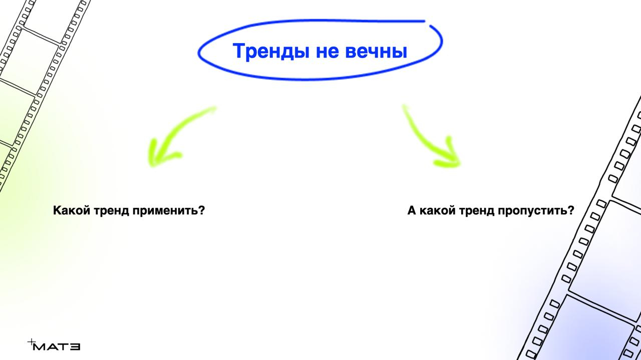 В соцсетях тренд живет считанные дни. В рекламе — месяцы. Если вы не успели подхватить волну за 2-3 недели, стоит искать другой прием. Брендам с длинным циклом согласований лучше ориентироваться на макротенденции.