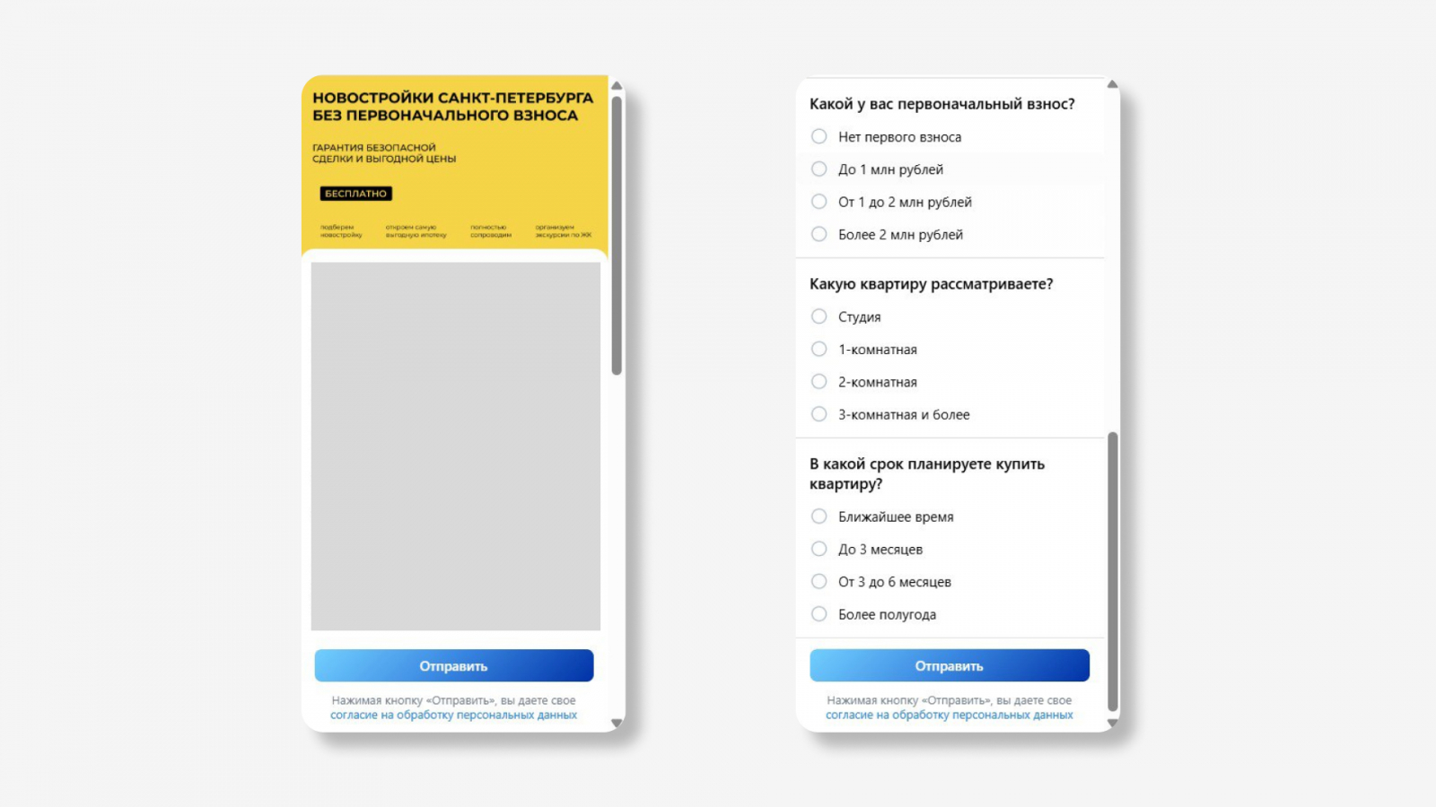 Пользователь видит объявление с ключевыми условиями или выгодным предложением, нажимает кнопку «Оставить заявку» и заполняет форму. Вопросы подбираются индивидуально под проект: это может быть интересующий тип недвижимости, бюджет, сроки покупки и другие параметры.