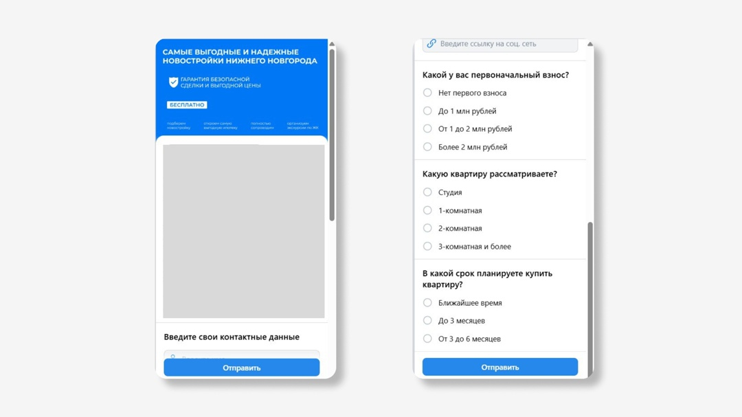 Для сбора заявок использовали встроенные лид-формы ВКонтакте. Это упрощает процесс: пользователю не нужно переходить на сайт, форма открывается прямо в объявлении. Всё, что нужно - ответить на несколько простых вопросов и оставить контакты.