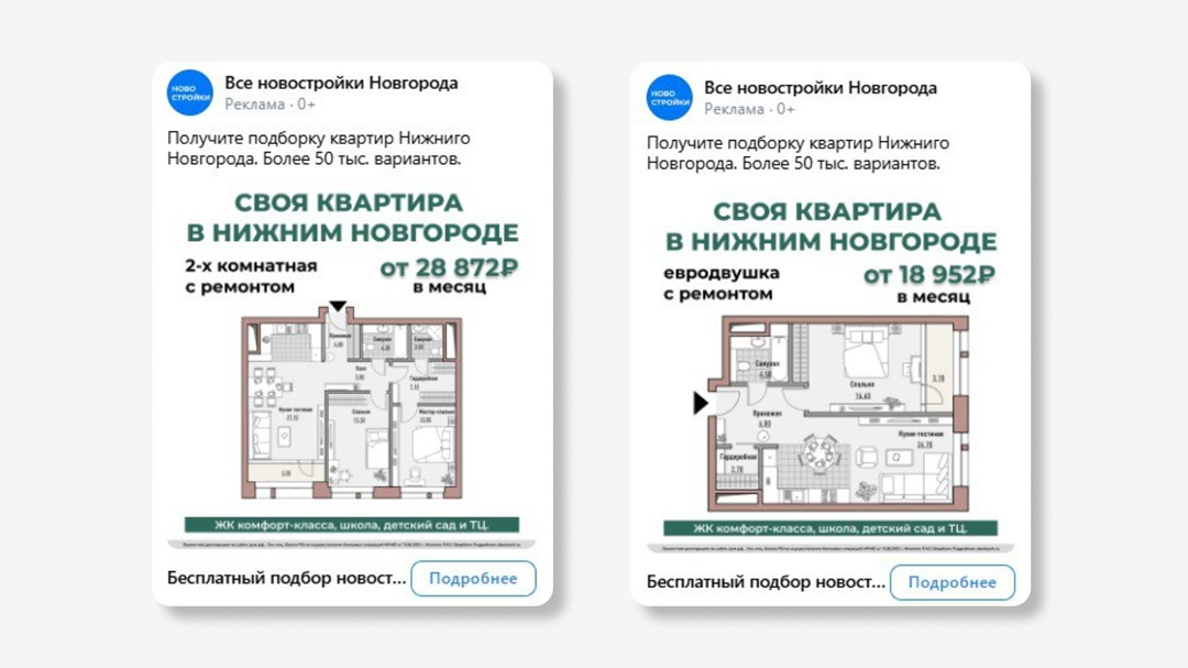 Рекламные кампании велись в Нижнем Новгороде и были ориентированы на всю Россию для пользователей, которые интересовались покупкой недвижимости именно в этом городе.