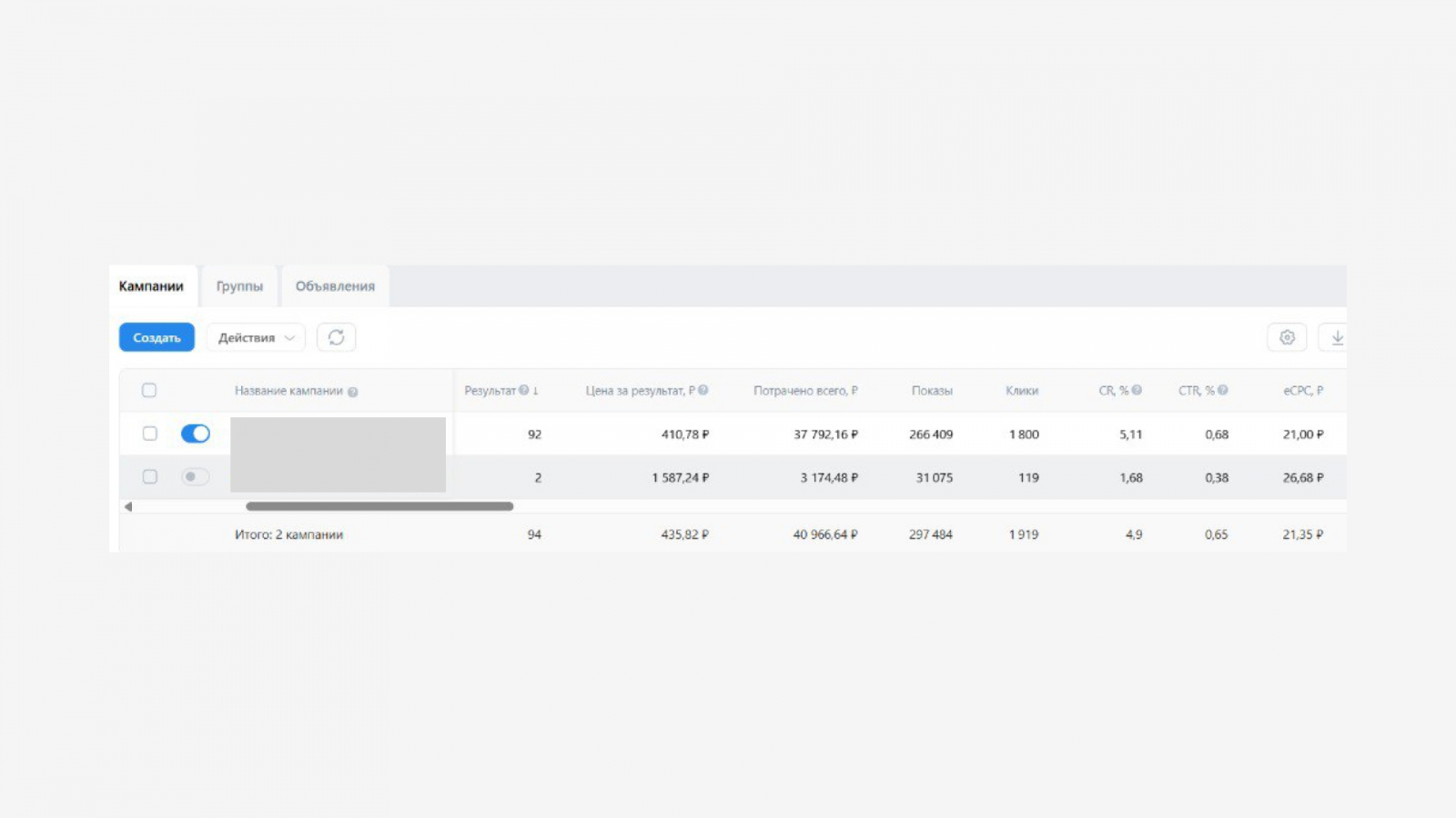 Ниже вы можете увидеть скриншоты из рекламного кабинета: