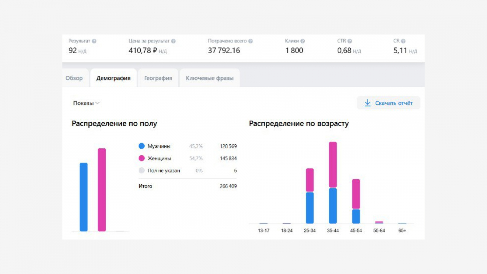 Ниже представлена статистика из рекламного кабинета Вконтакте: