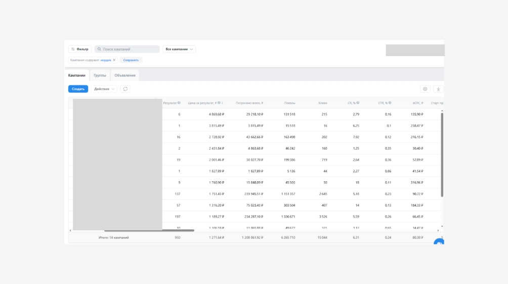 Мы использовали 14 рекламных кампаний, в которых было 259 групп объявлений и 288 креативов — чтобы охватить максимум гипотез и протестировать разные сегменты аудитории.