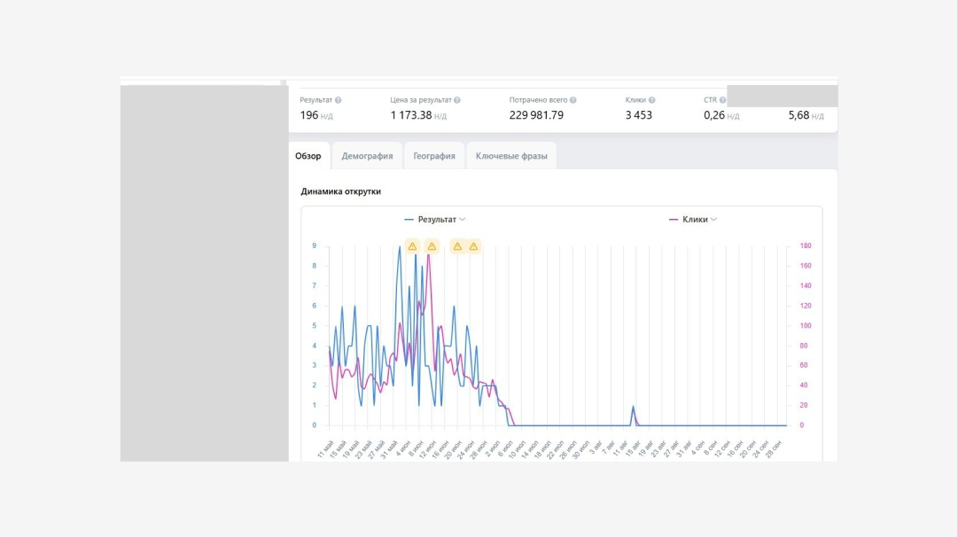 Ниже вы можете увидеть скриншоты статистики из рекламного кабинета: