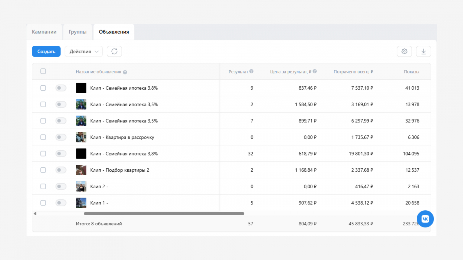 Ниже вы можете увидеть скриншот статистики из рекламного кабинета: