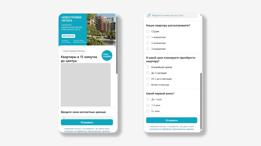Для сбора заявок мы использовали подробные и удобные лид-формы, которые помогали не просто получить контакт, а понять потребности клиента. В форме была возможность выбрать тип квартиры, указать предполагаемый первоначальный взнос и срок, когда планируется покупка. Это позволило нам сегментировать аудиторию и сразу предлагать более релевантные варианты недвижимости.