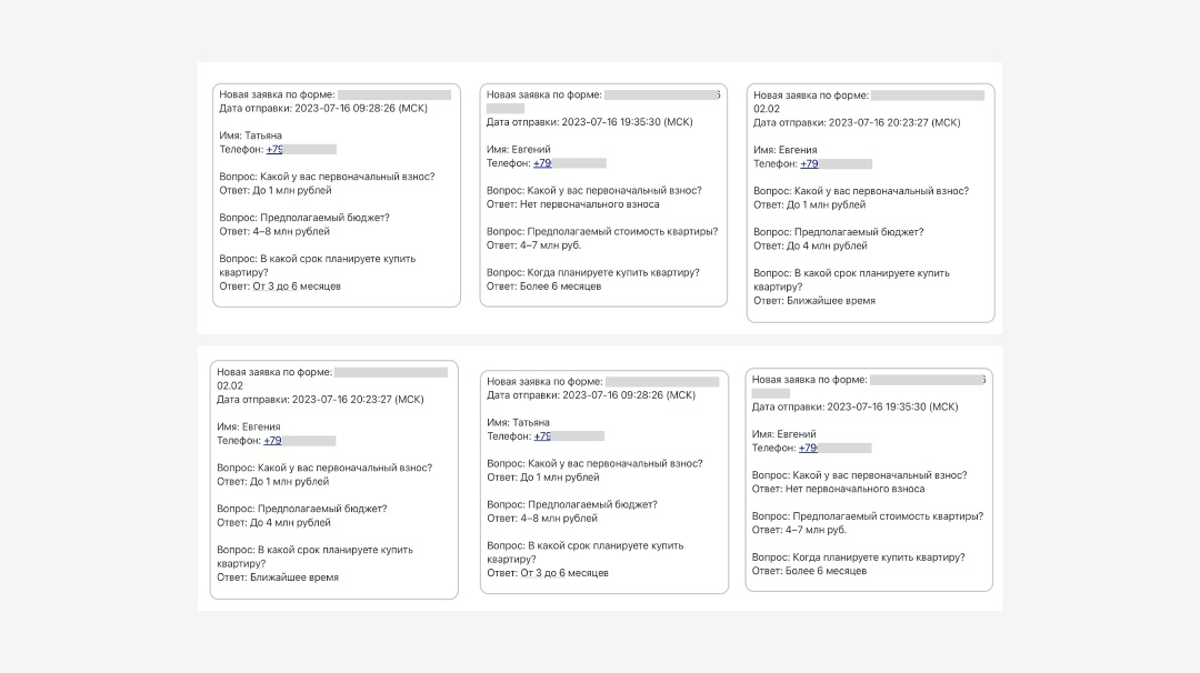 Ниже — примеры реальных заявок, чтобы вы увидели, какую информацию получают риелторы и как клиенты откликаются на объявления