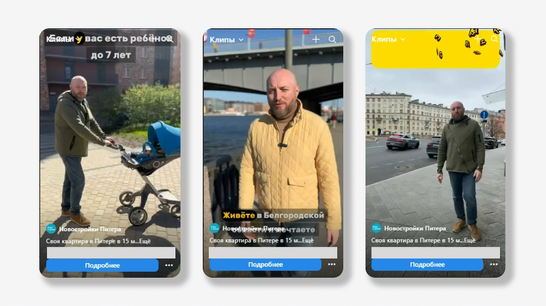 В клипах снимался сам риэлтор. Без актеров, без заученных текстов и без давления. Живая подача, спокойный тон и конкретика по условиям создавали ощущение личного контакта и повышали доверие.
