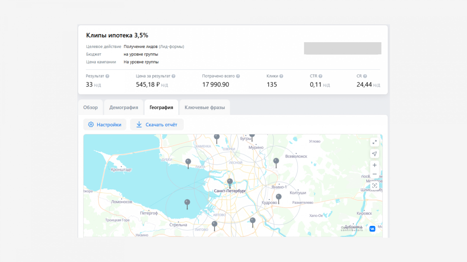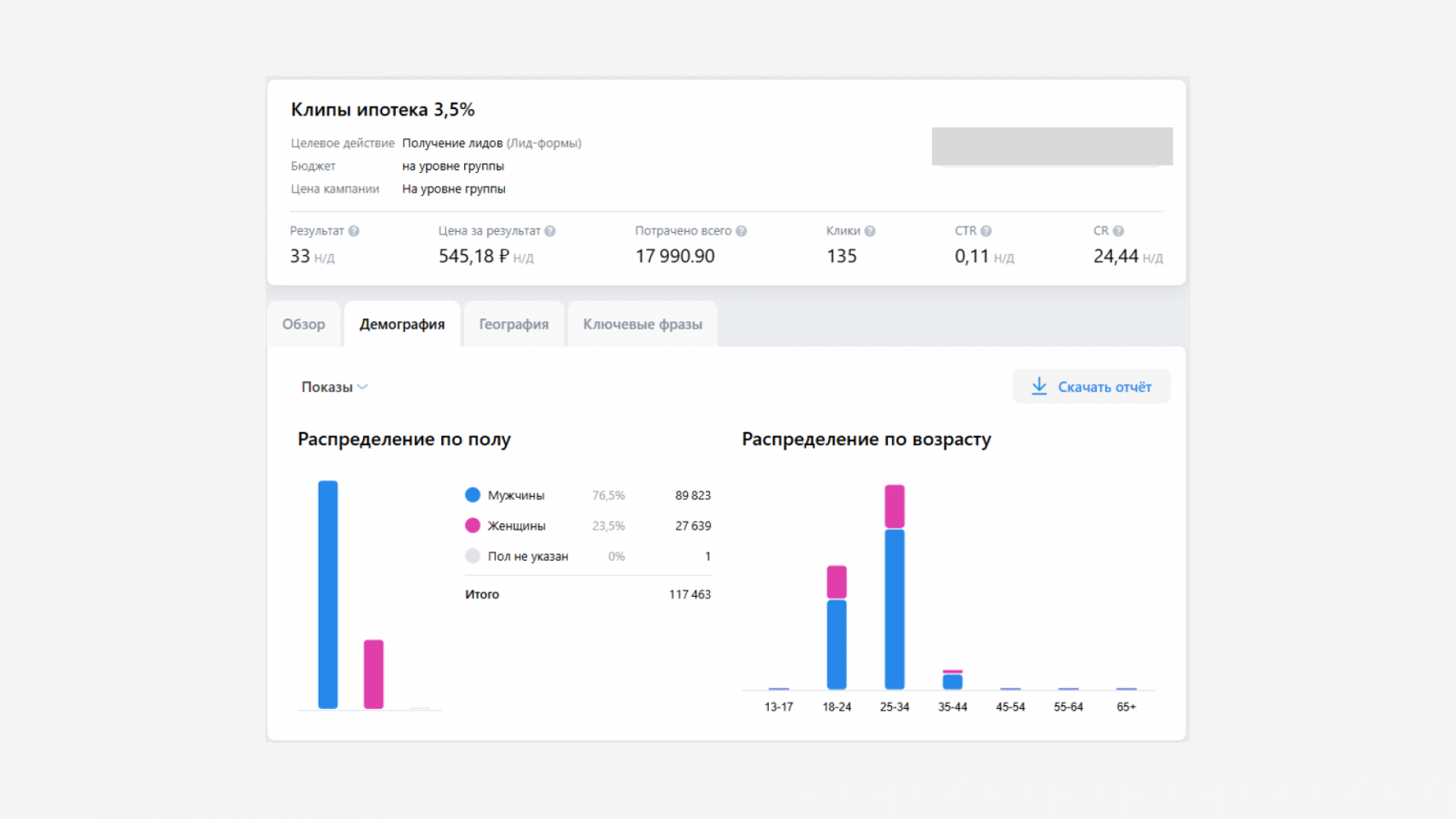 Таргетинг выстраивался комплексно. В работе использовались широкие аудитории, интересы, связанные с недвижимостью и ипотекой, а также ключевые запросы.