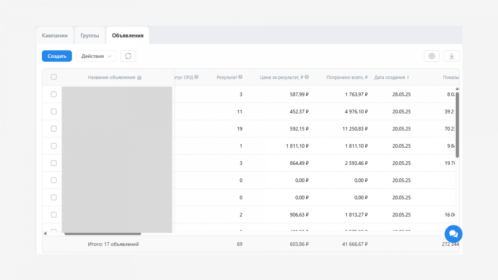 За один месяц рекламной кампании при бюджете 50 000 рублей было получено 69 заявок. Средняя стоимость одной заявки составила 603 рубля.