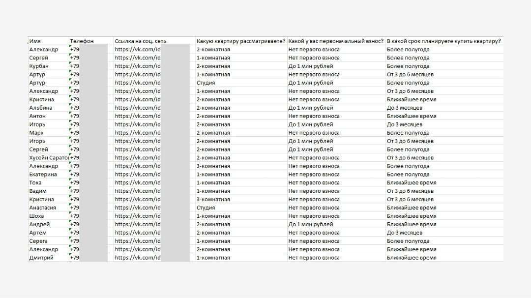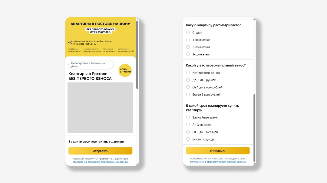 Чаще всего мы используем лид-формы во ВКонтакте — это удобный способ собирать заявки прямо из объявления. Пользователю не нужно переходить на сайт: форма открывается сразу, и он может быстро оставить свои контакты, ответив на несколько простых вопросов, например, о бюджете, интересующем районе или сроках покупки.