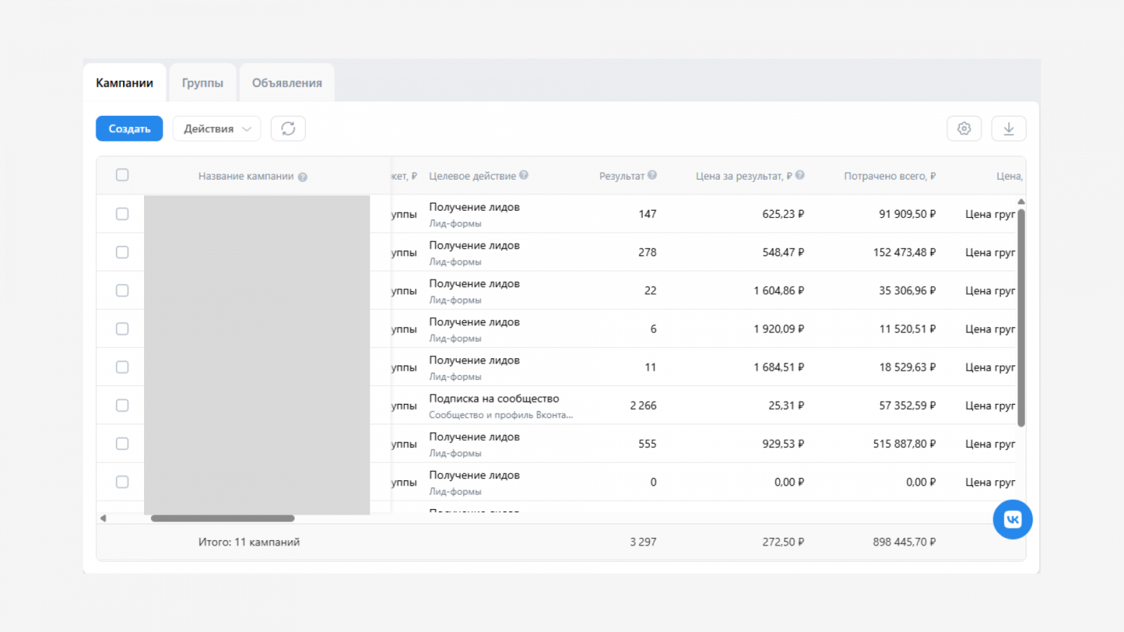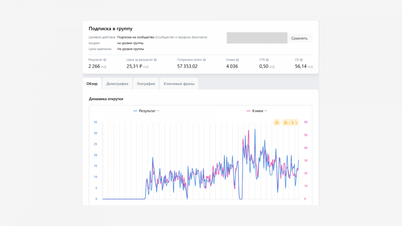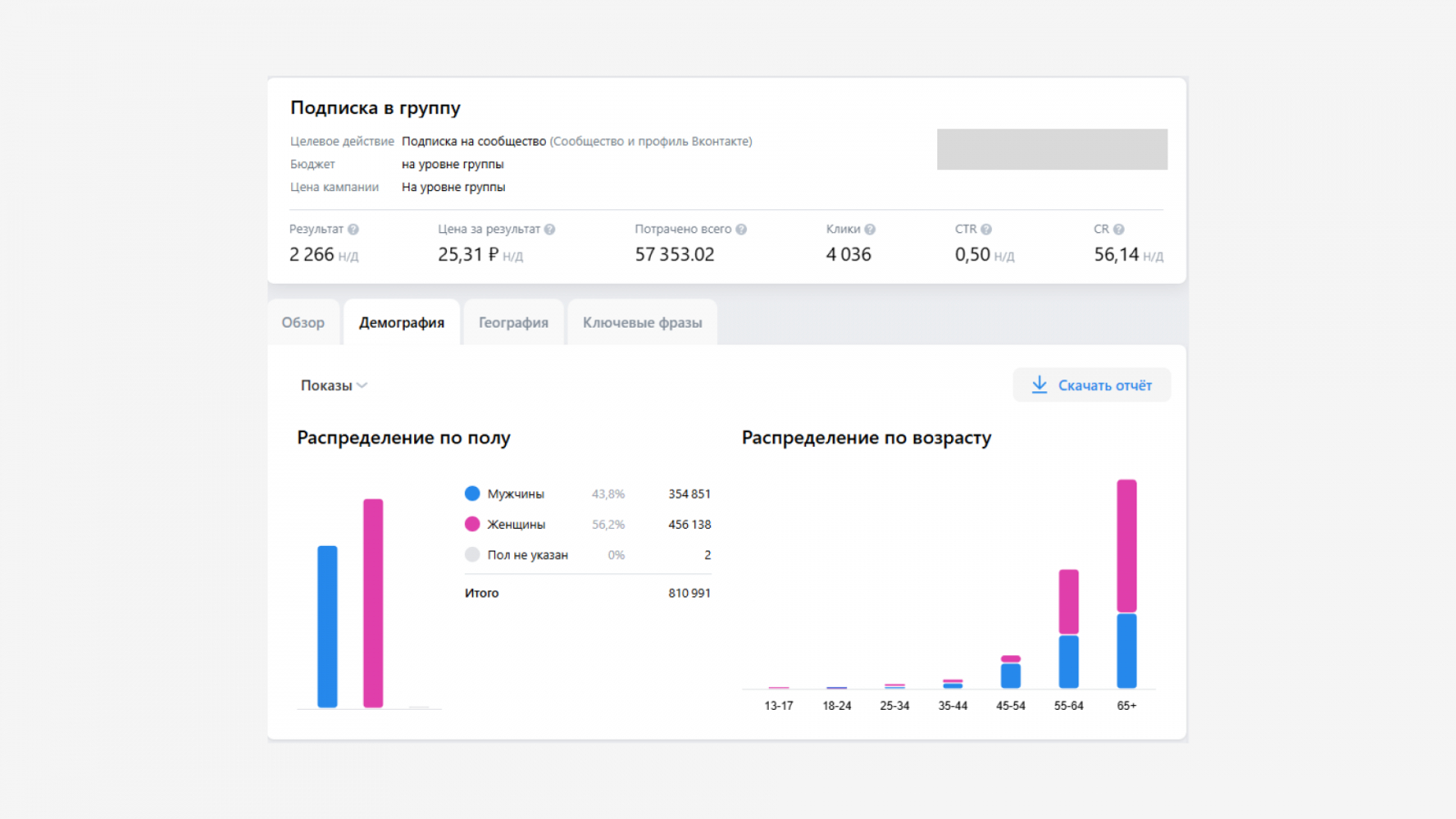 Ниже представлена статистика по кампании на подписку из рекламного кабинета:
