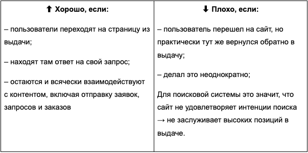 Клики по ссылкам. Чем активнее пользователь взаимодействует с контентом сайта (выделяет части текста, нажимает на кнопки и ссылки, переходит по разделам), тем лучше.