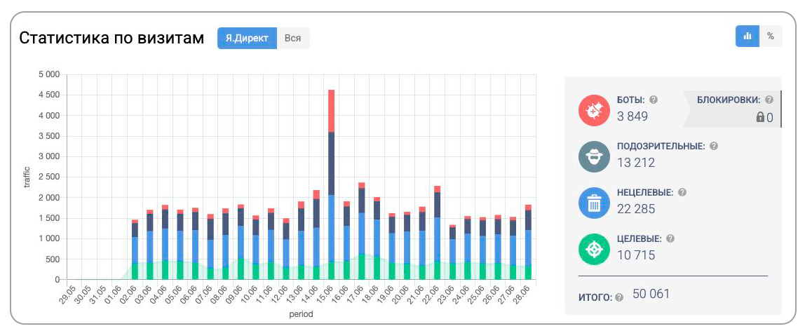 На старте, при подключении любой рекламной кампании, мы разблокировки показ рекламы магазина посуды для этой базы — в мае она достигла 57,2 млн ботов и скликивателей. Это позволило нам отсечь общий мошеннический трафик по рекламе, перейти к более подробному анализу визитов и блокировке «персональных» скликивателей.