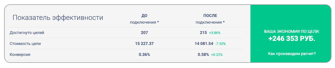 Нам удалось высвободить и сэкономить на рекламе клиенту более 246 000 рублей: количество целей (215 шт.) умножили на разницу в стоимости цели (1145,83 руб.). Эти средства можно направить на развитие бизнеса, инвестиции в другие маркетинговые каналы привлечения целевых клиентов и на другие нужды.