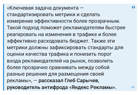 Вот комментарий руководителя антифрода «Яндекс Рекламы», который приводит канал «Рекламная индустрия России | РИР» , о данном стандарте:
