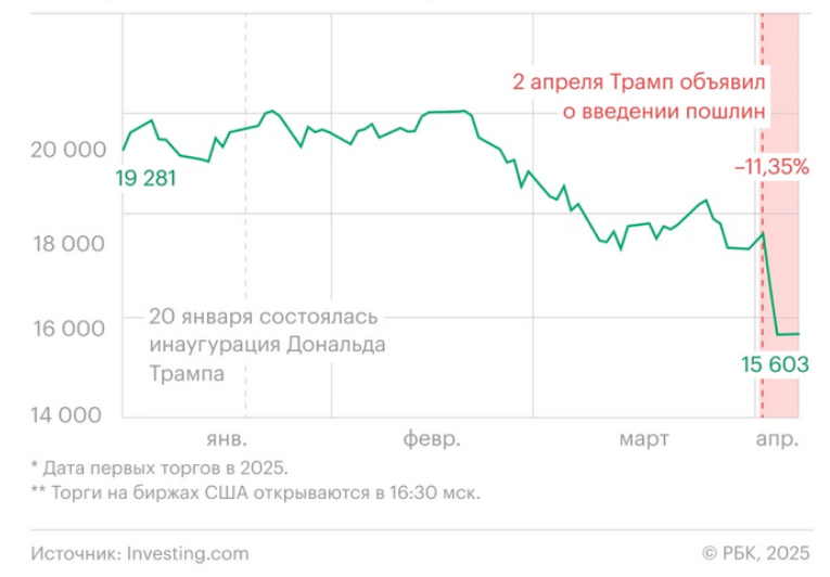 UPD: на момент написания этой статьи индекс NASDAQ вырос на 12,16%, а индекс Dow Jones поднялся на 2965 пунктов. Это произошло на фоне новости о том, что Трамп на 90 дней приостанавливает действия крупнейших пошлин для более 75 стран. Но ситуация постоянно меняется.