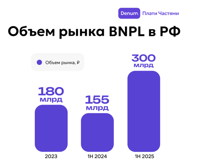 Однако очевидно, что эта ниша обладает большим потенциалом. За первые шесть месяцев 2025 года объем рынка BNPL-сервисов в России увеличился почти вдвое и достиг 300 млрд руб., в то время как за аналогичный период 2024 года он составил 155 млрд. Все те же 300 млрд — это общий объем рынка за весь предыдущий год, что свою очередь было в 1,6 раза больше 2023 года (180 млрд руб.). К концу 2025-го ожидается, что объем рынка превысит 700 млрд руб. Основной фактор роста — увеличение онлайн-продаж, в первую очередь товаров повседневного спроса, а также активность крупных маркетплейсов.