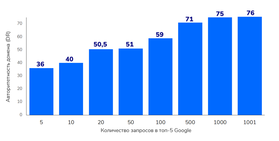 По данным исследования Sape, ссылки на сайт с других авторитетных ресурсов — один из ключевых факторов для ранжирования в тематике «Финансы». Так, например, обнаружена прямая корреляция между количеством запросов в топе выдачи и показателем авторитетности домена, зависящим от количества и качества внешних ссылок: