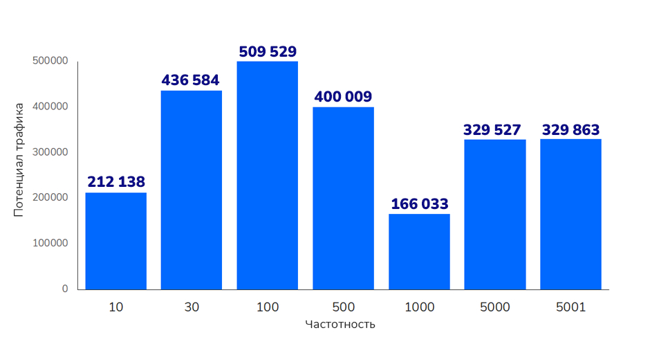 - Потенциал трафика разных групп запросов по частотности сильно различается. Многие полагают, что чем выше спрос, тем выше и возможный объем привлекаемого трафика, но такой закономерности на самом деле нет. Согласно данным упомянутого исследования, потенциал трафика выше всего у запросов с частотностью от 30 до 100: