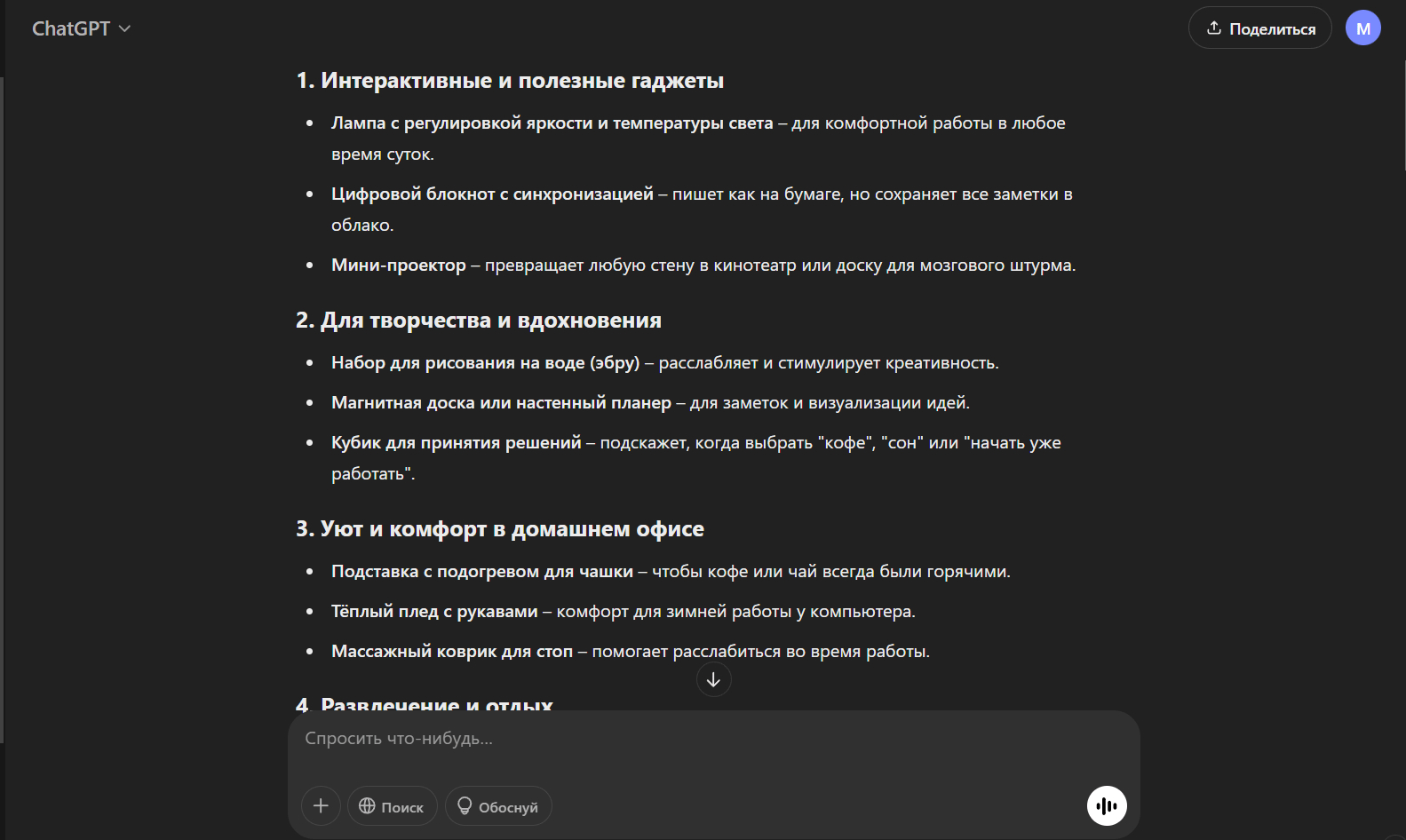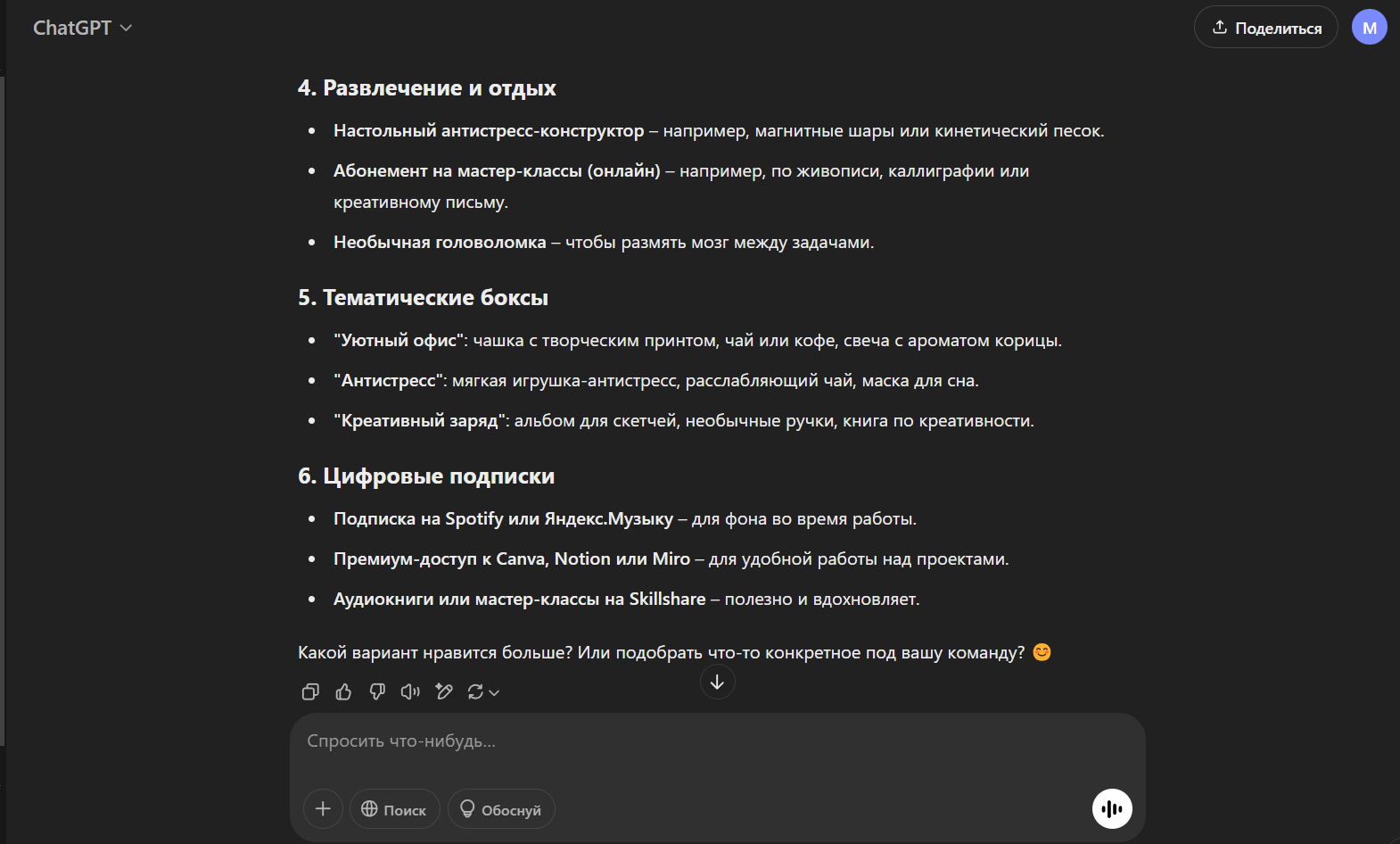 GPT предложил цифровые подарки, мастер-классы, тематические боксы и многое другое. На заметку, из предложенного взяли: