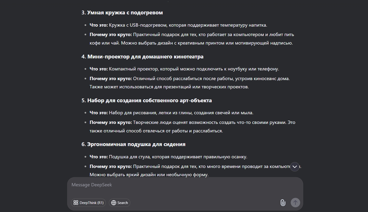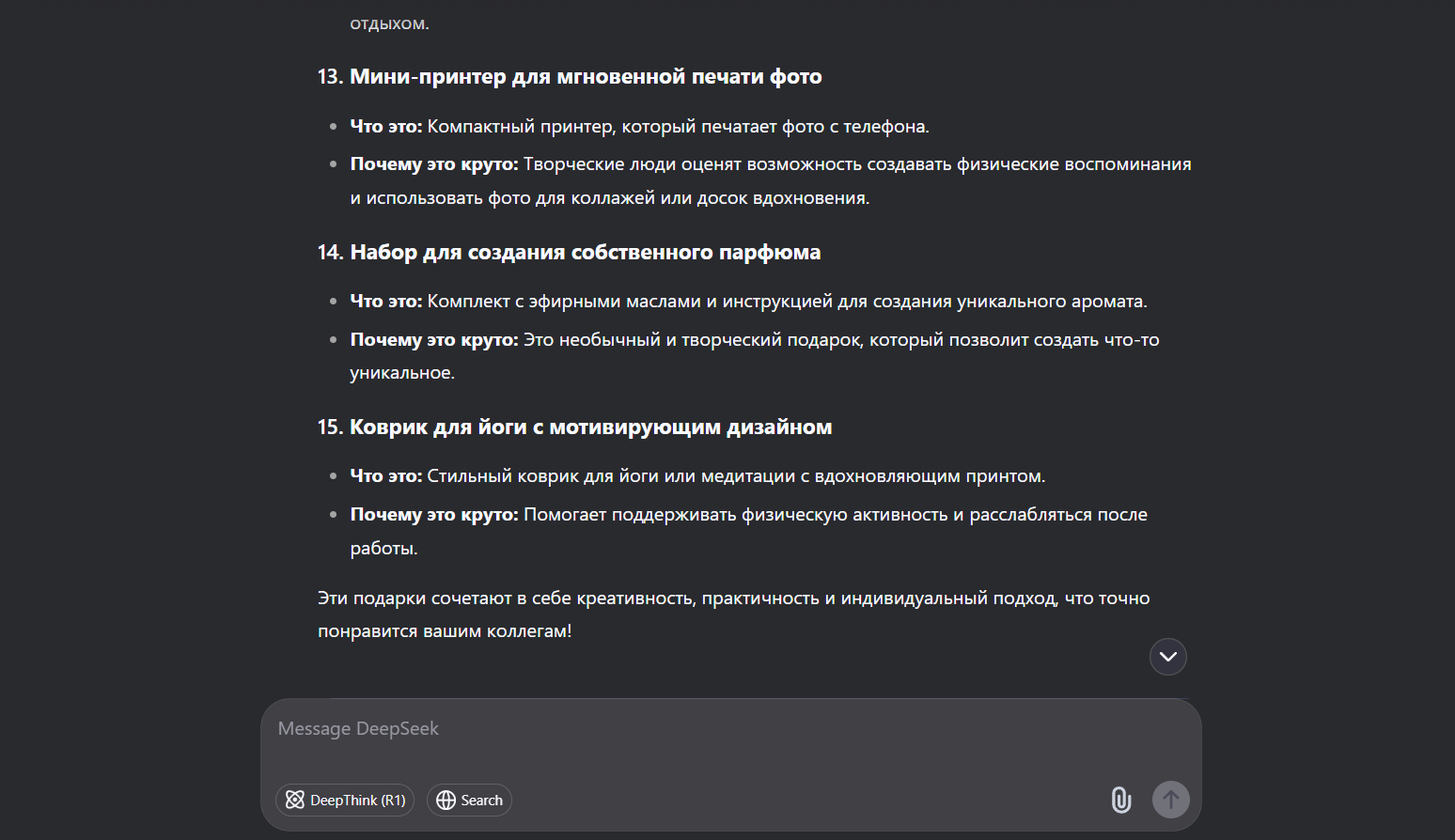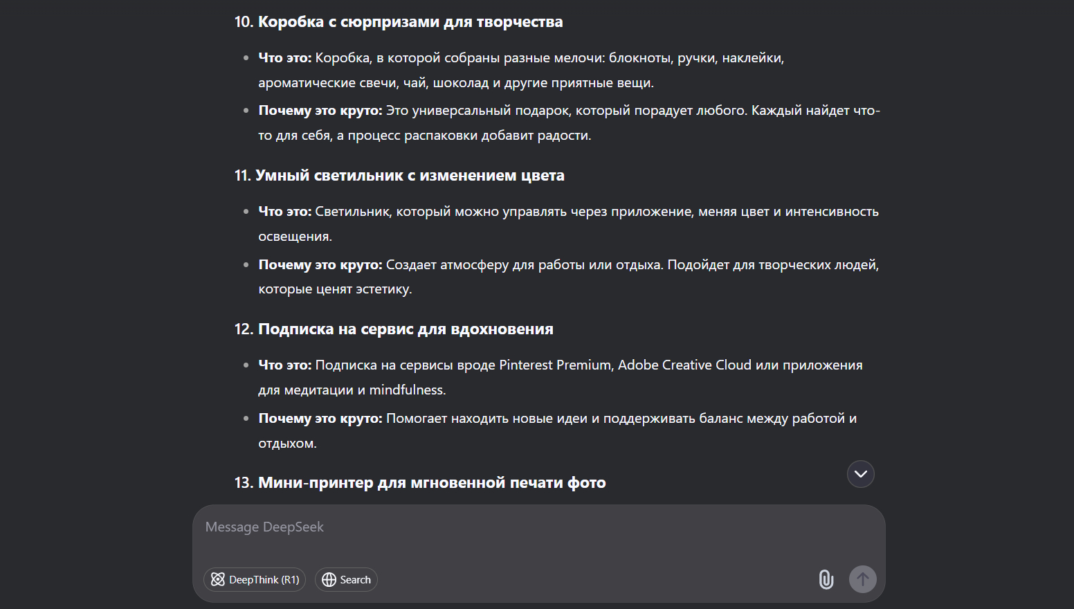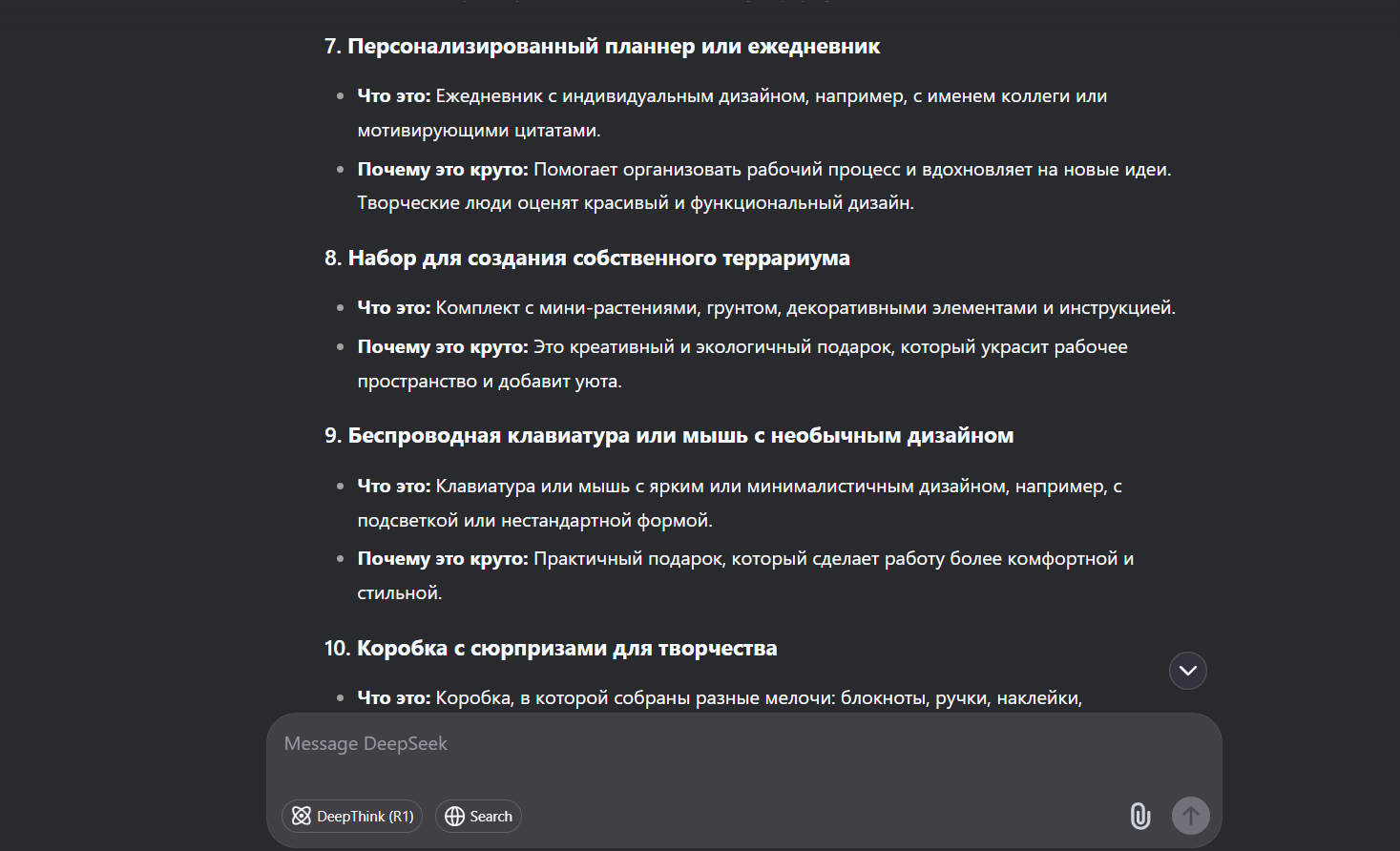 В отличие от ChatGPT, DeepSeek предложил индивидуализированные решения, такие как создание персонализированных подарков, например, набор для творчества, планер или ежедневник.