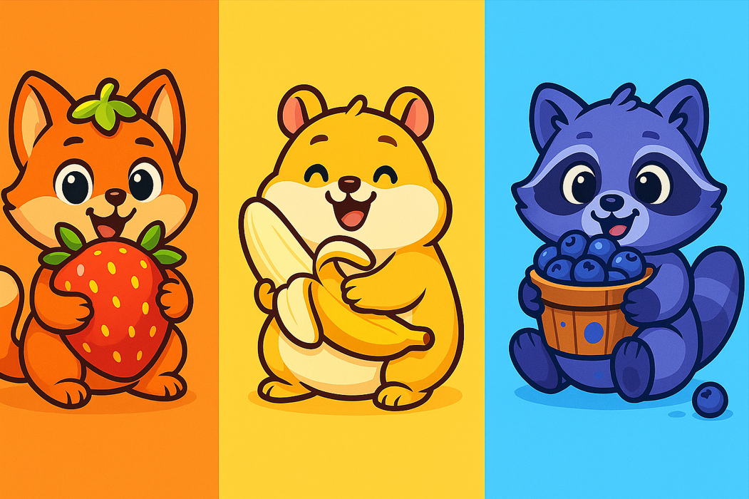 Промпт: “Создай веселых, вымышленных зверьков в мультяшном стиле, в лапах они должны держать фрукты и ягоды. Стилизация под кондитерскую тематику упаковок трубочек для молока, бренда "Терефимка". Персонажи должны иметь округлые формы, простую рисовку и дружелюбный вид. Цвета нужно использовать яркие, так как целевая аудитория это дети.”