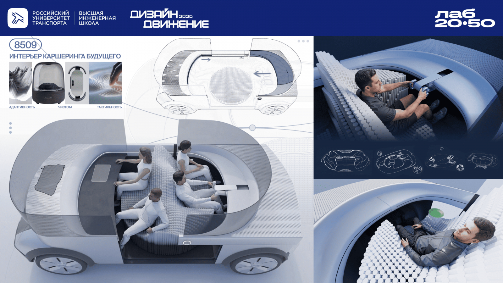 Задача разработки интерьера каршеринга будущего была поставлена перед участниками IV Международного хакатона «Дизайн Движение». Командам предложили спроектировать концепции для горизонта 2030–2050 годов — с учётом изменения пользовательских привычек и развития транспортных сервисов. Победителем в этом направлении стала команда «8509» Высшей инженерной школы Российского университета транспорта. В своей концепции участники сосредоточились на пользовательском сценарии: автомобиль рассматривается не как универсальное пространство «для всех», а как гибкая среда, способная адаптироваться под конкретного человека и его цели — будь то короткая городская поездка, работа в пути или отдых. Ключевым решением стало сочетание технологичности и эмоционального дизайна: интерьер не только функционален, но и формирует индивидуальный пользовательский опыт даже в условиях краткосрочного использования. «Баланс между будущим и реальностью» По словам Алексей Шаршаков, шеф-дизайнера Национального центра промышленного дизайна и инноваций «Лаб 20/50», задача, поставленная перед участниками, отражает реальный запрос индустрии: «Каршеринг становится такой же привычной услугой, как заказ кофе, но это не отменяет потребности человека в эмоциях и комфорте. Победившая команда смогла найти баланс между футуристичным видением и реальностью. Их концепция демонстрирует глубокую проработку пользовательского сценария и имеет потенциал для практического применения».