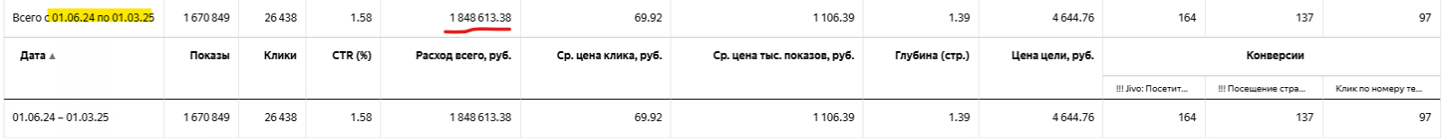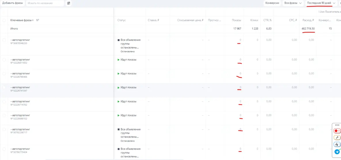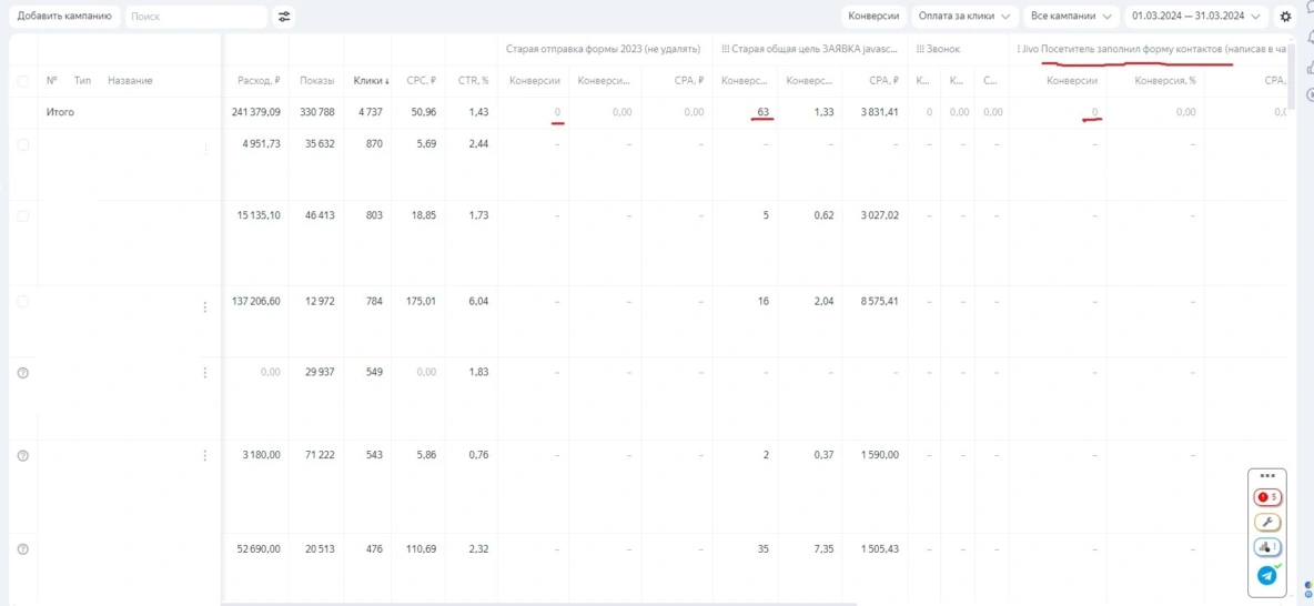 Соответственно в первую очередь настроили нормальные цели (посещение страницы Спасибо и онлайн-чат с администратором), в дальнейшем использовали их для оптимизации в кампаниях.