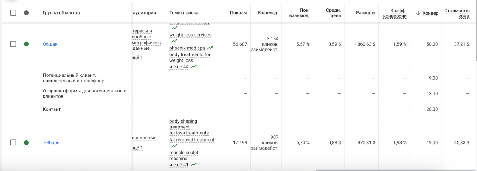Поэтому выделили еще несколько услуг, на которые был спрос уже не гипотетический, как на старте проекта, а фактический, исходя из отклика аудитории, обращающеся с рекламы. Аналогично были доработаны посадочные страницы и запущены отдельные группы объявлений с рекламой услуг Diamond Glow и Injectables.